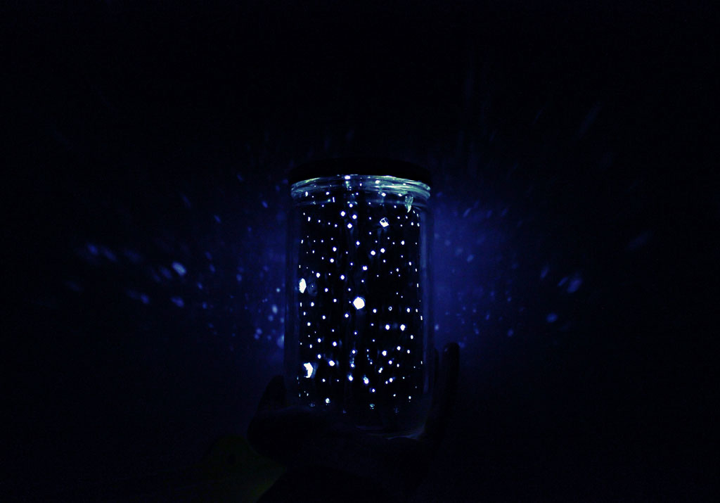Prendete la teglia in alluminio e tagliate il fondo fino a ricavare questa misura: 13×23 cm; forate il rettangolo ottenuto con l’aiuto di una matita e di un ago avendo cura di fare fori di dimensioni differenti. Ora modellate l’alluminio a mo’ di cilindro per inserirlo nel barattolo (diametro barattolo 7,5 cm – h 14,5 cm). Mettete all’interno la lampada a led, accendete e voilà. Il gioco è fatto!
