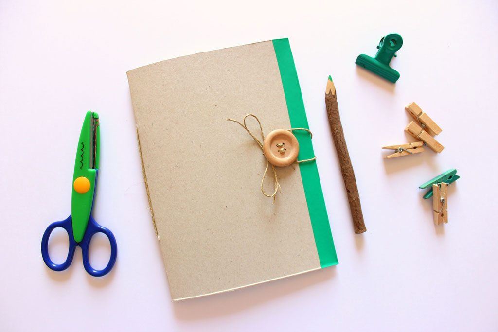 Per rifinire il quaderno utilizziamo il washi tape. Io l’ho scelto monocolore e verde perché volevo accentuare l’aspetto green del progetto, ma voi sbizzarritevi! Quindi mettete una striscia di nastro adesivo su ambo i lati (verticali) del notes. Poi prendete il bottone e cucitelo al centro del bordo copertina con lo stesso spago con cui avete effettuato la rilegatura.