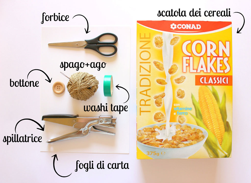 A questo punto piegate il cartoncino in due lasciando all’interno la parte stampata. Diventerà la copertina del vostro notes. Con l’aiuto dell’ago fate due fori sulla piega che si è creata. Non è necessario prendere le misure, potete fare anche ad occhio. Io sono contro al righello a tutti i costi e così facendo ho sviluppato un occhio davvero preciso (modestia a parte 😉 )! I buchi dovranno avere circa 3 cm di distanza dal bordo. Ora prendete i fogli bianchi. Usatene tanti quanto volete sarà doppio il vostro notes. Io ne ho messi solo 4 (considerate che i fogli del notes risulteranno 8) perché lo volevo leggero e comodo da mettere in borsetta. Piegate i fogli in due parti e sovrapponeteli al cartoncino. Però devo dire una cosa importante! Le confezioni dei cereali non sono tutte uguali e nel mio caso i fogli da stampante (fogli A4) erano troppo grandi e li ho ritagliati a misura. Quindi tutto dipende da quale scatola di cereali utilizzerete.