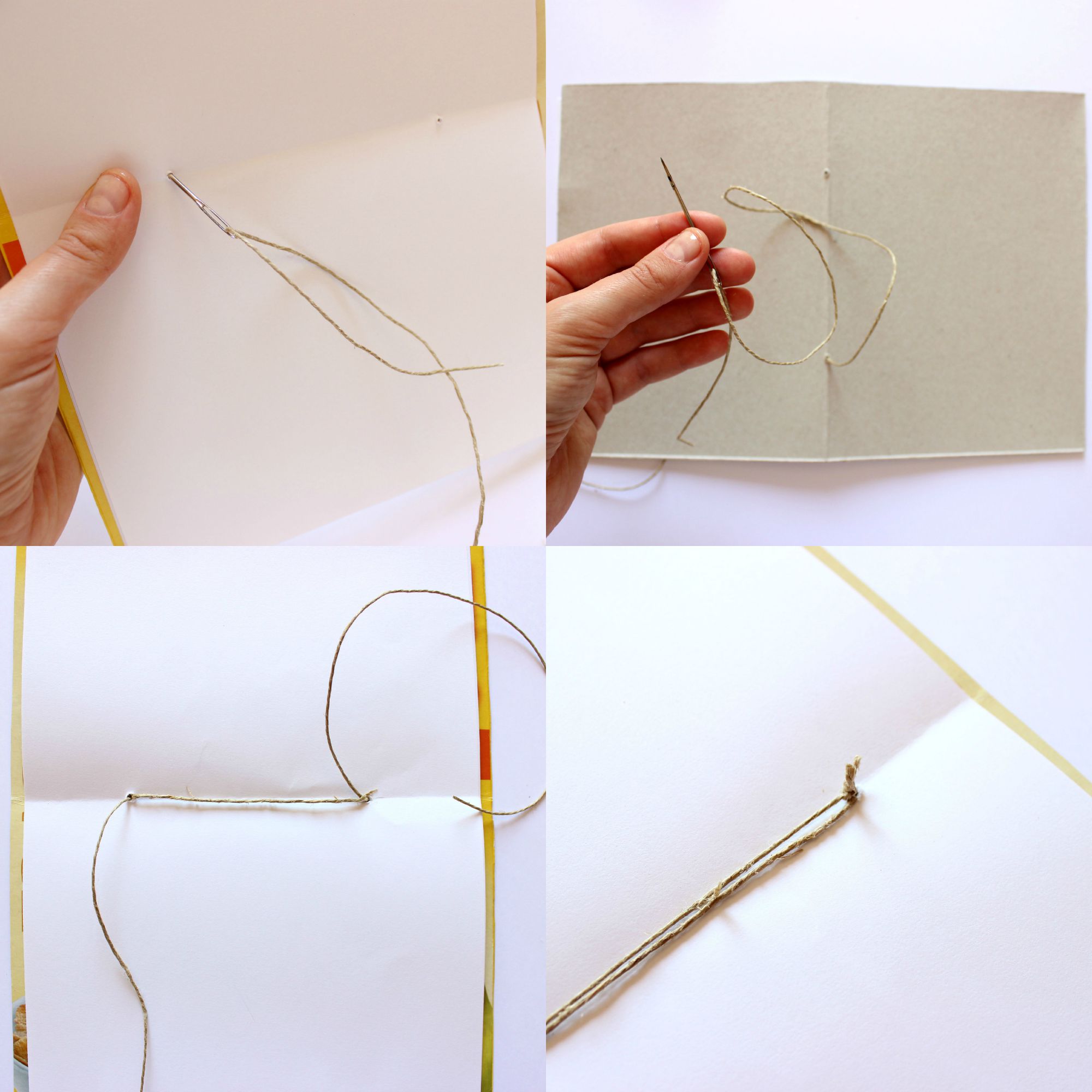 Iniziate a cucire partendo dall’interno e immaginate di dover unire i due punti. Per avere una rilegatura più resistente fate due giri. Alla fine vi ritroverete due estremità di spago nella parte interna del quaderno che chiuderete con un nodo, come in foto.