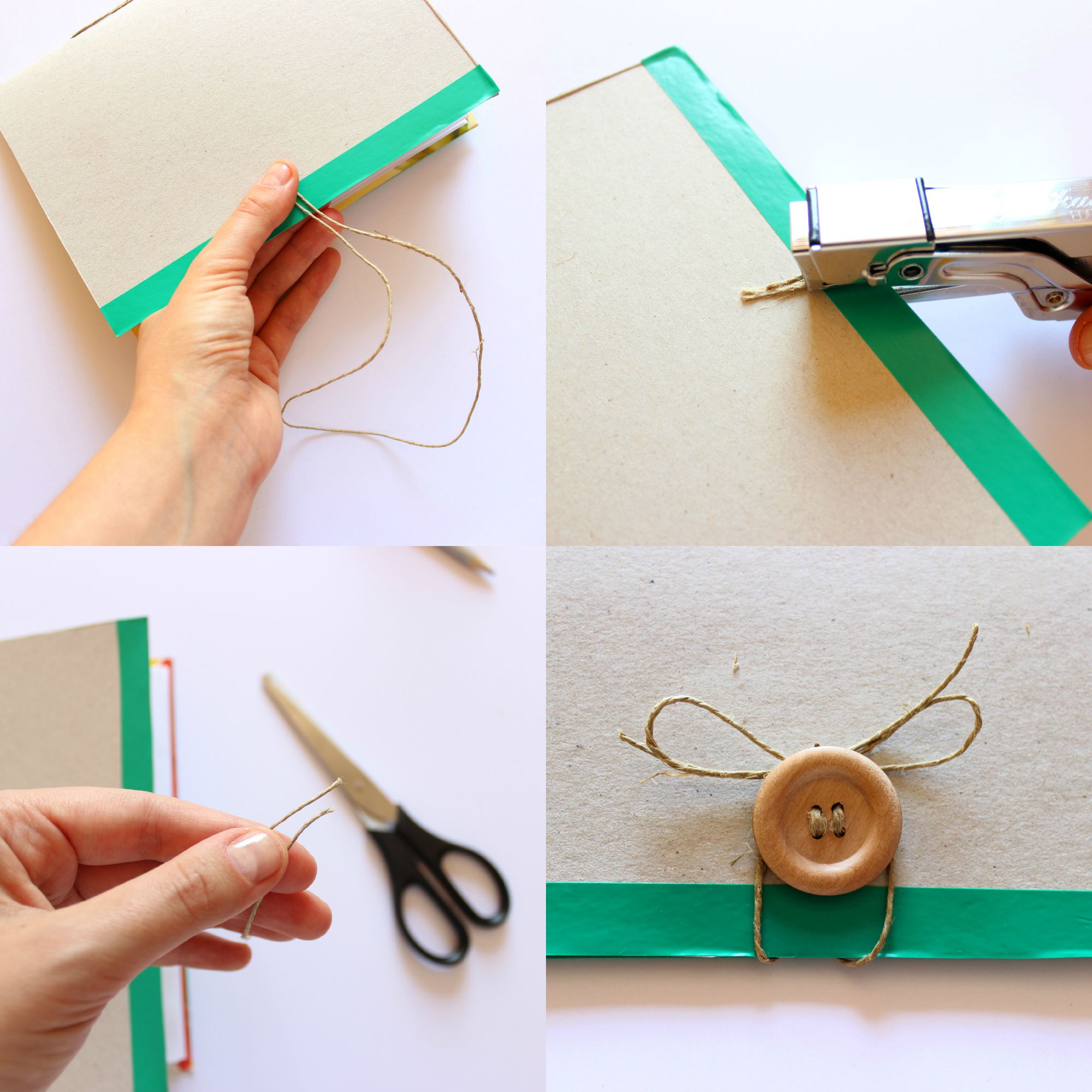 Ora con un altro pezzo di spago faremo la chiusura del notes. Create un cappio e con la spillatrice fermate le due estremità del filo sul retro del quaderno, sempre al centro del bordo (in linea col bottone). Tagliate e in questo modo avrete due fili per formare un fiocco attorno al bottone.