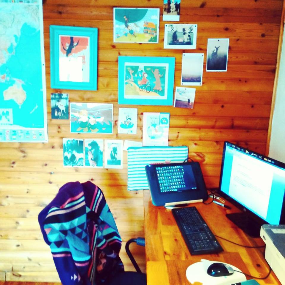 Mi piacerebbe molto avere il tavolo sgombro e pulito ma non è quasi mai così…a questo punto comincio a pensare che forse il disordine è una mia prerogativa per l’ispirazione…Poi preferisco quando c’è la gatta vicino a me, una tazza di caffè, i miei quadretti alle pareti…insomma mi piace lavorare in una ambiente a mia immagine, mi rilassa.