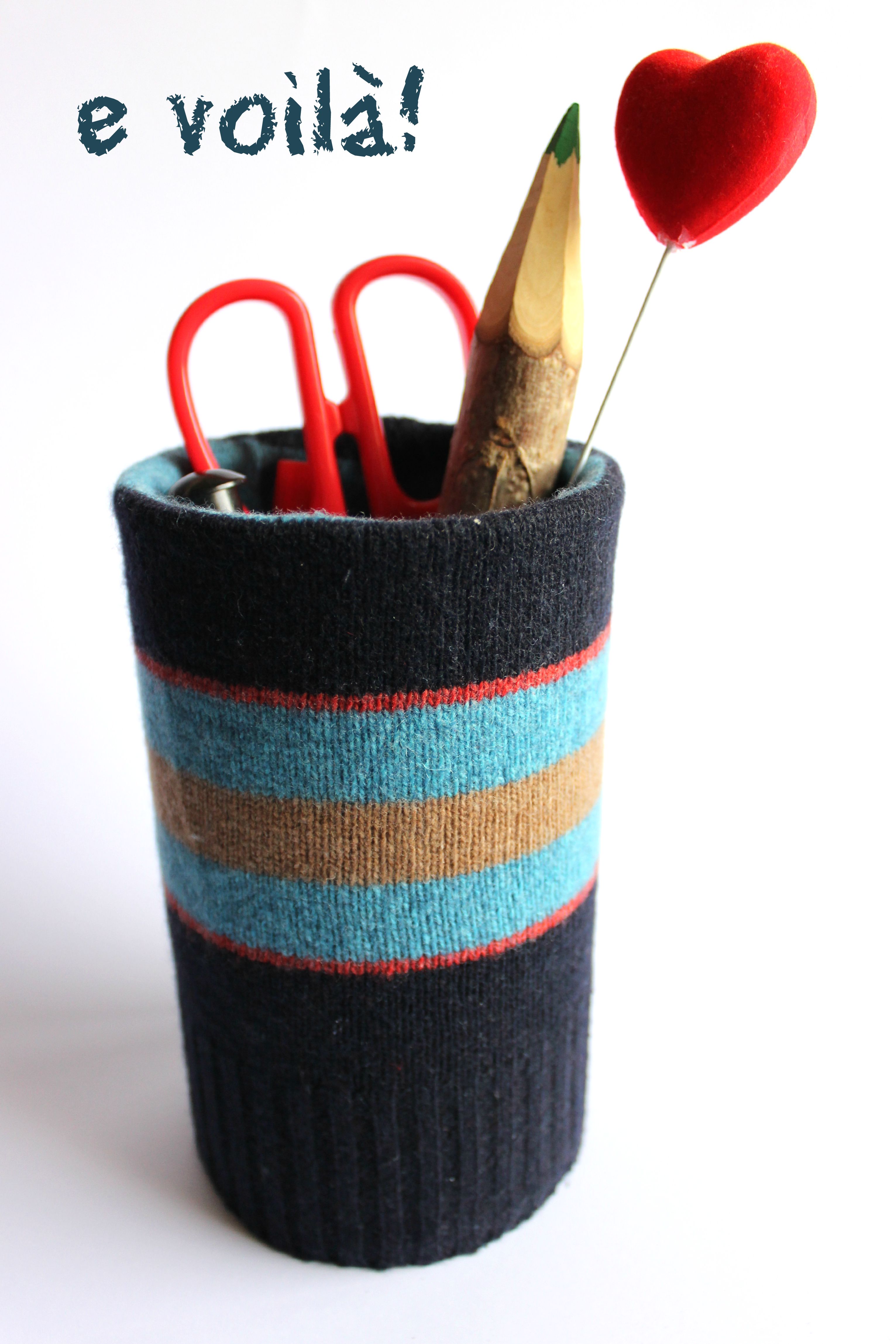 E voilà! Il vostro portapenne è già pronto. Potete realizzarne un altro uguale con l’altra manica del maglione e riciclare in questo modo tutte quelle maglie inutilizzate che spunteranno fuori dall’armadio per il cambio di stagione. Parola d’ordine: non si butta via nulla!