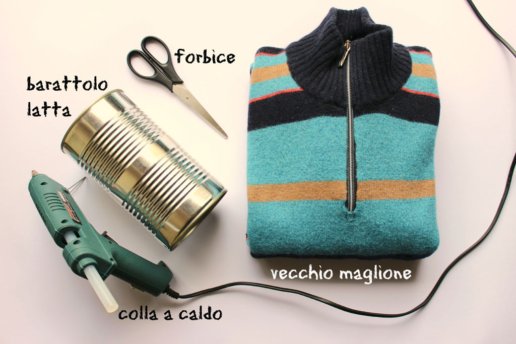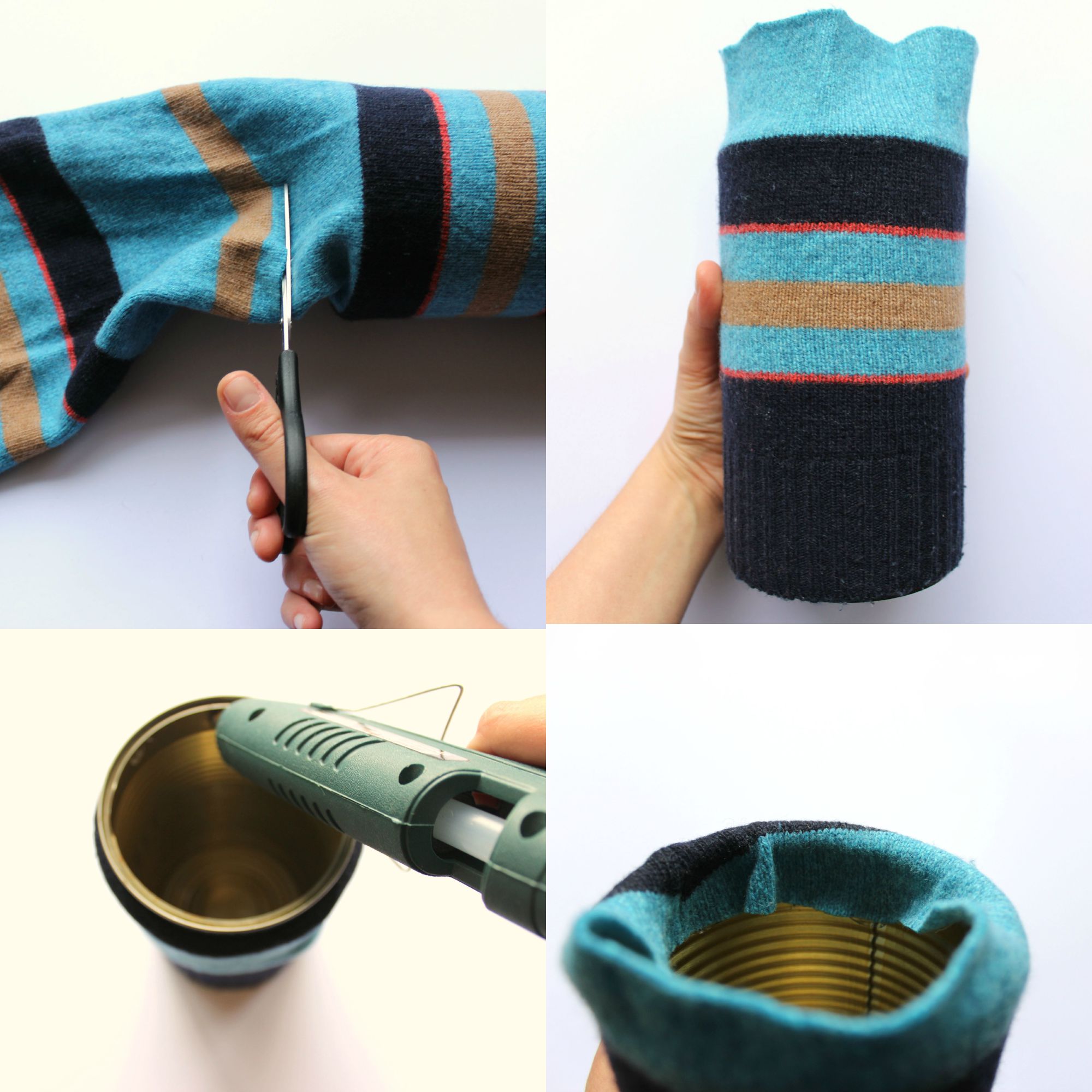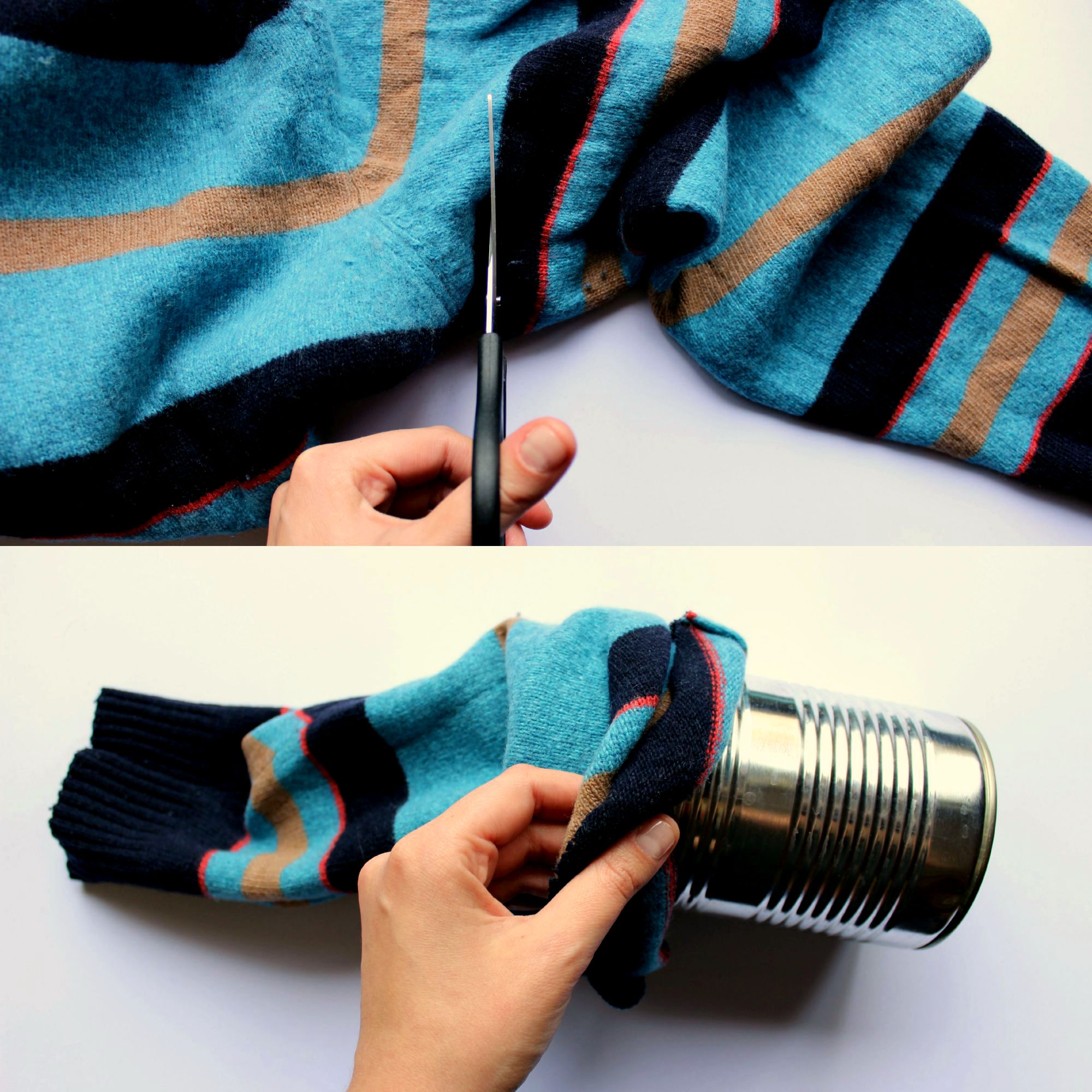 Tagliate la manica del vostro maglione e infilatela nel barattolo di latta per rivestirlo.