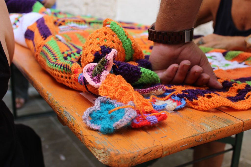 Inoltre vi ricordate di Trame Urbane? Avevo condiviso l’evento tempo fa sul mio profilo facebook: un’azione di guerriglia urbana a cui ho partecipato anch’io con la mia pezzetta rosa 20×20 sferruzzata dietro il mio spazio espositivo di Week Hand e forse non proprio 20×20 dato che non avevo un metro sottomano.