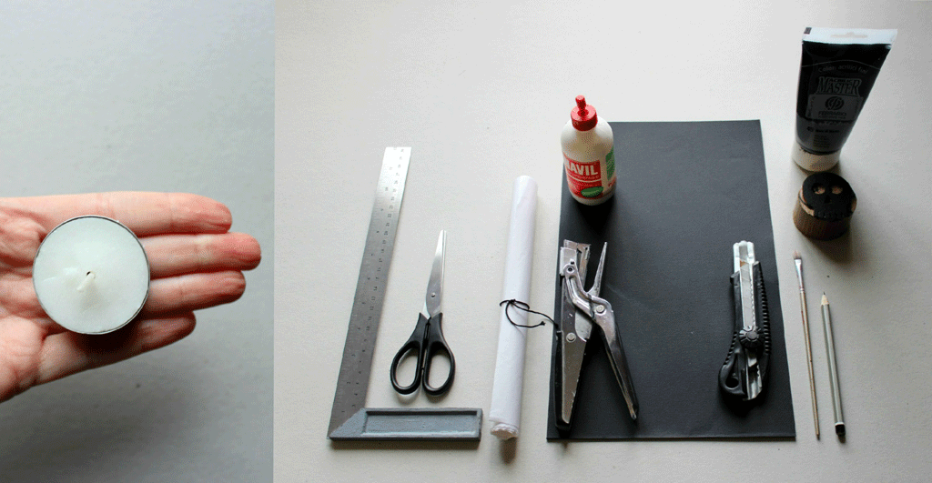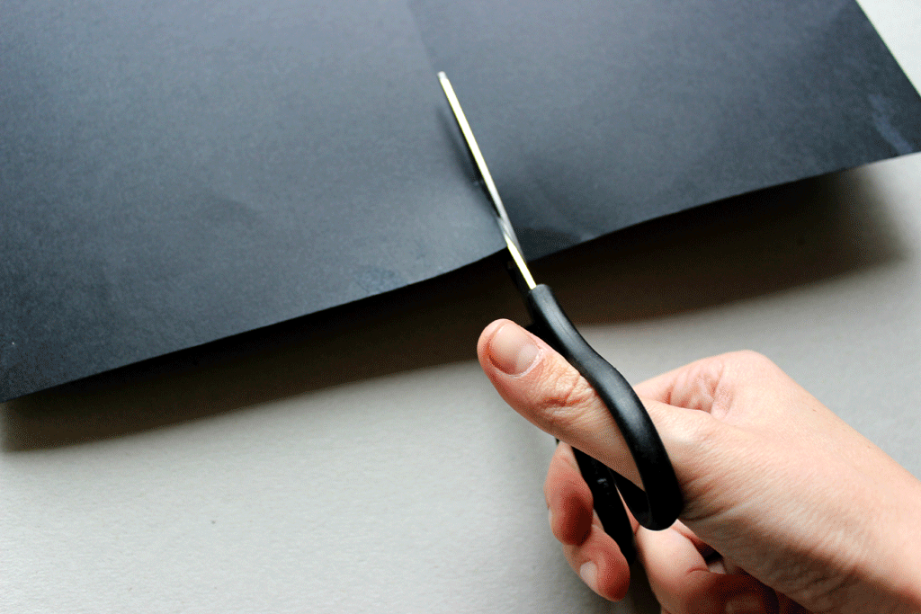 Prendete il cartoncino nero che dovrà misurare circa 20 x 32 cm e con la riga misurate il centro esatto, segnate con la matita e poi piegate in due parti in quel punto.