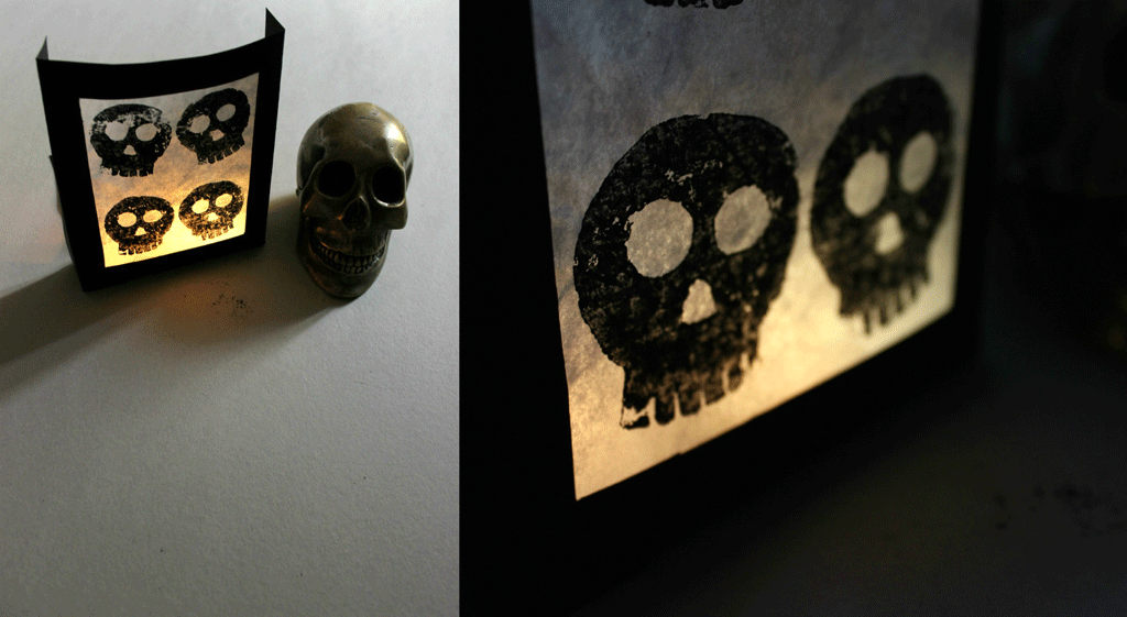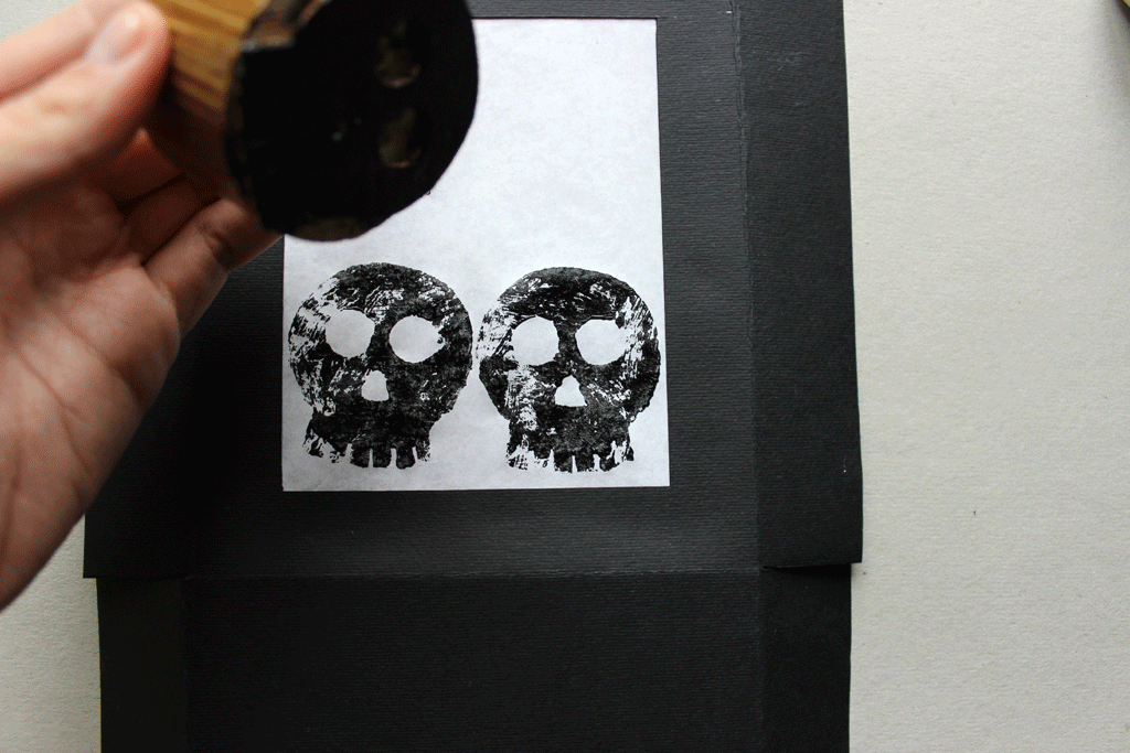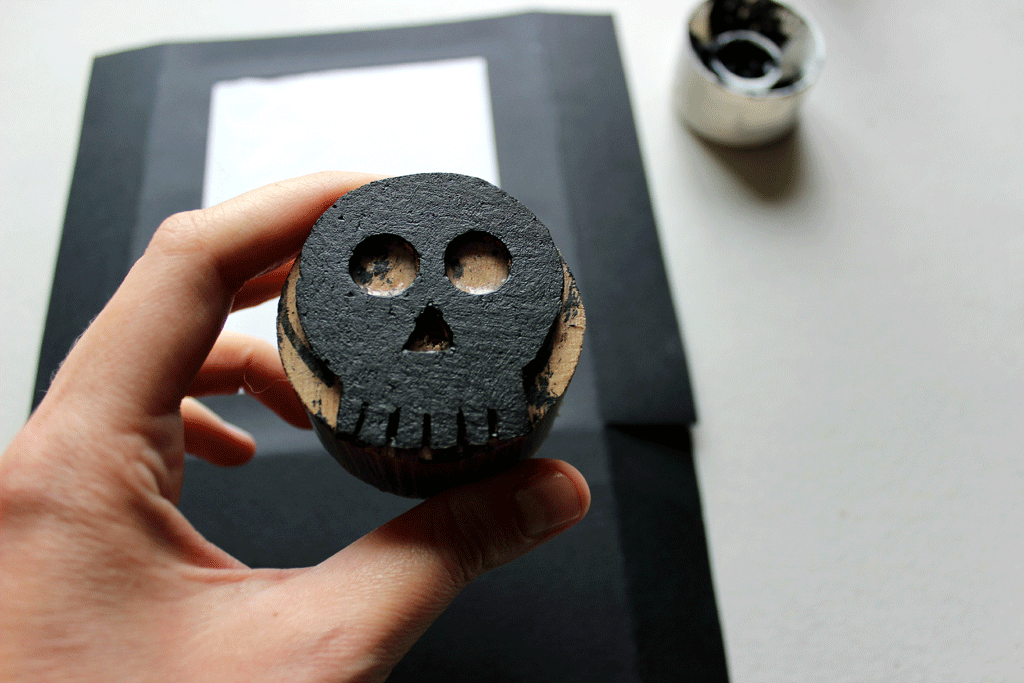 Adesso arriva la parte più divertente perché stamperemo i teschi sulla carta. Se non riuscite a trovare un timbro a teschio niente paura, perché lo trovate disponibile sul mio shop online di A little Market dei timbri teschio realizzati a mano con legno di riciclo e sughero.