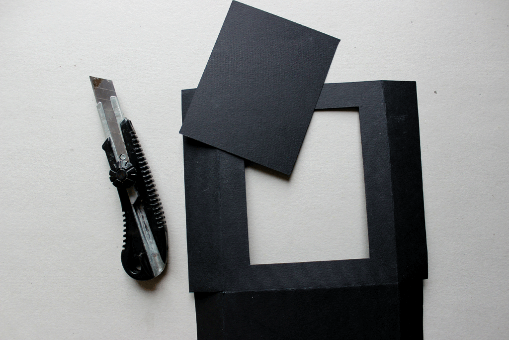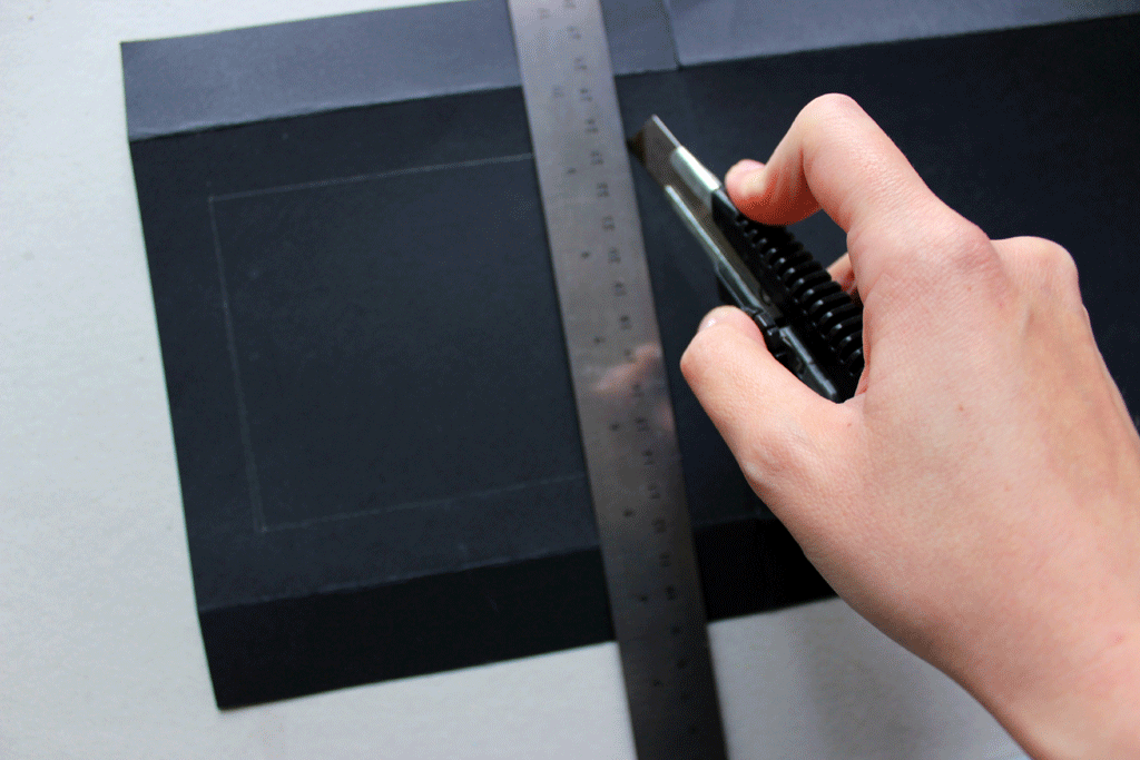 A questo punto mettete il cartoncino al dritto e disegnate, solo su un lato, un quadrato che si distanzi dal bordo di 2 cm per ciascun lato. Ritagliatelo con il cutter.
