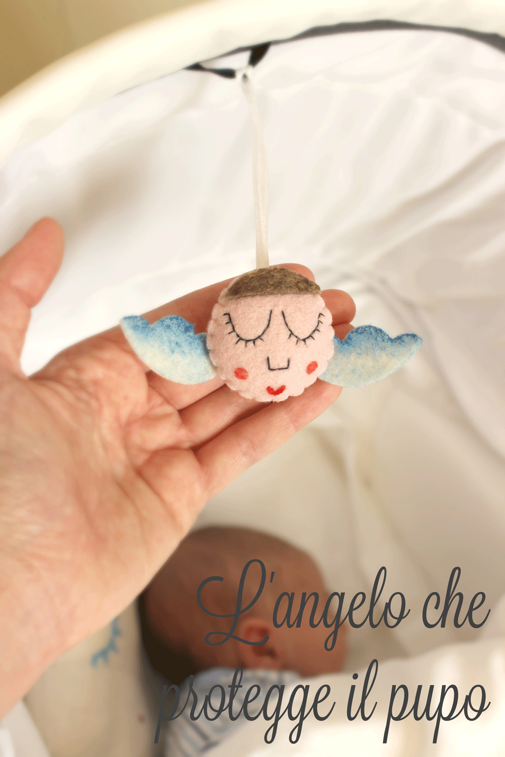 Potevo fermarmi qui? Certo che no! Volevo un qualcosa che fosse simbolo di protezione e una sorta di porta fortuna. Meglio di un angelo? Niente! Da appendere alla carrozzina l’angioletto accompagnerà i suoi dolci sonni. Realizzato in morbido feltro con dettagli ricamati a mano. Non è amorevole?