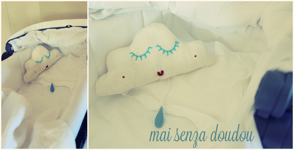 Sapete cos’è un doudou? Il doudou è un oggetto transazionale. Rappresenta un sostituto della mamma che rassicura e calma il bambino aiutandolo a gestire in modo sereno il distacco materno. La mamma deve dormire con il doudou a contatto con la sua pelle possibilmente già dagli ultimi mesi della gravidanza, in modo da fargli assorbire l’odore. E’ per questo che il doudou è stato il primo regalo che ho fatto al nipote, e alla sorella. In sostanza il bambino sentendo il profumo della mamma riesce a calmarsi anche quando lei non è accanto a lui. In Francia il doudou è una cosa molto seria, fa parte della famiglia prima ancora che il bambino venga al mondo e molti giornali riservano pagine agli annunci di doudou scomparsi. Vi mostro quello che ho realizzato io. E’ a forma di nuvola, in cotone ricamato a mano e imbottito con lana naturale.