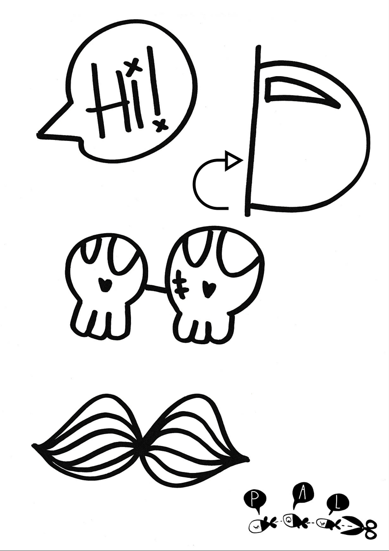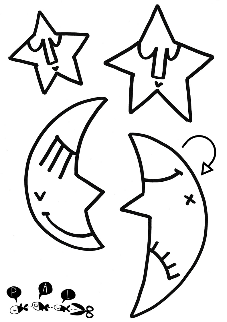 Innanzitutto scaricate i disegni che ho realizzato per voi. Qui trovate stelle&lune, qui baffi&co. Dove c’è la freccia è perché il disegno indicato è all’inverso (perdonatemi, questioni di spazio sul foglio).