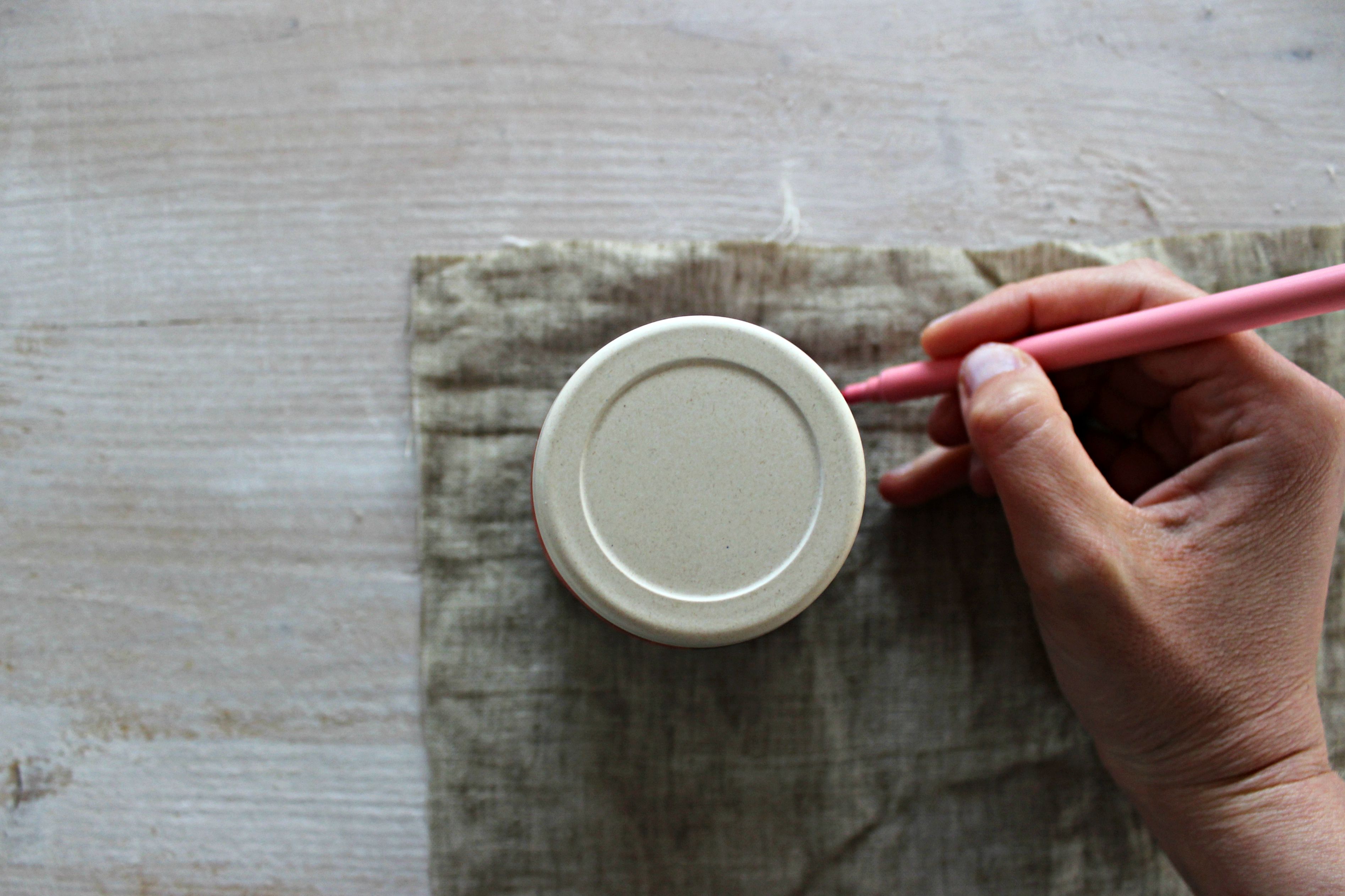 Per iniziare prendete il tessuto beige e tracciate la circonferenza del bicchiere usando una penna o un pennarello. Non è importante che sia appositamente per tessuti, perché non sarà visibile. Segnate il tessuto al dritto.