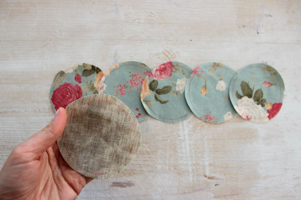 Ricavate un cerchio di tessuto beige e cinque cerchi di tessuto fantasia.