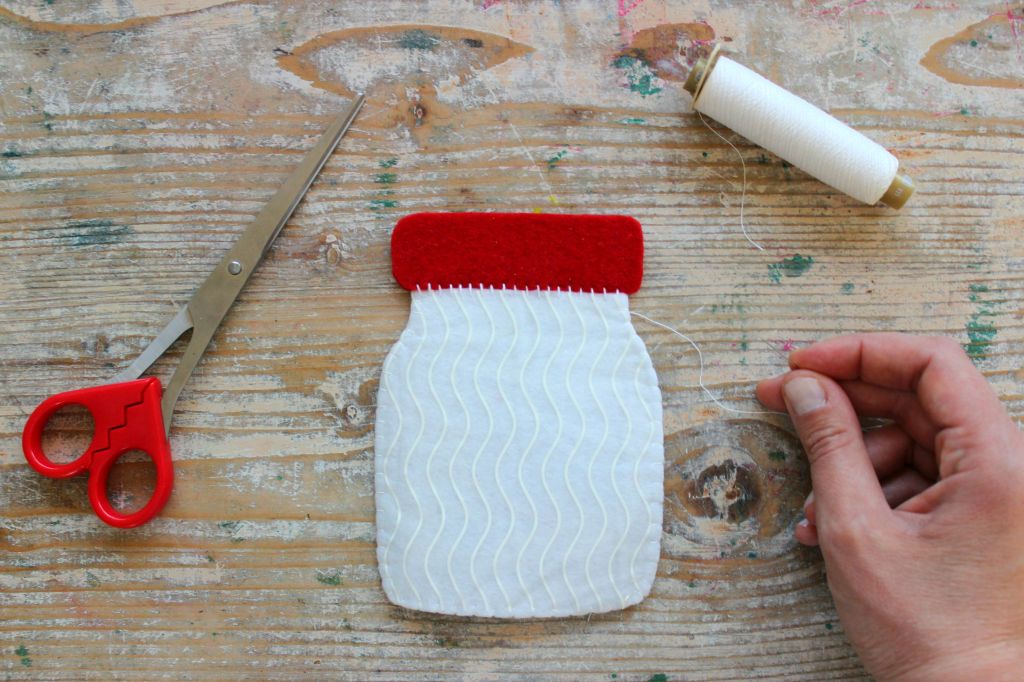 Con ago e filo cucite il tappo sulla sagoma del barattolo. Vi consiglio di utilizzare un filo un po’ spesso come quello da ricamo, per ottenere una cucitura più resistente e anche più bella da vedere.