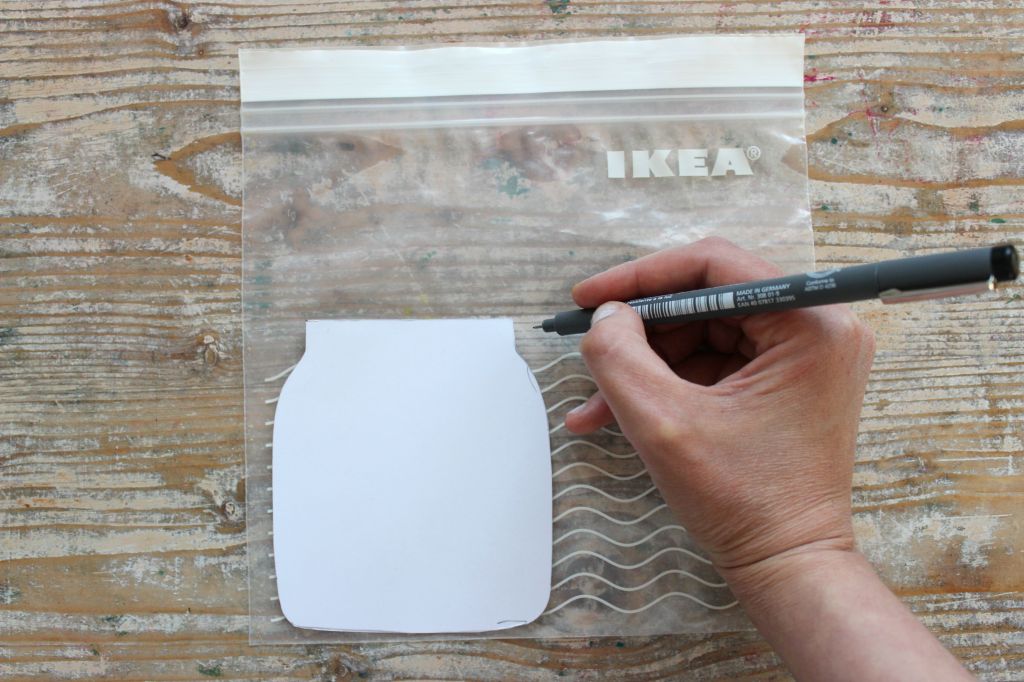 Ponete su un sacchetto di plastica di quelli riutilizzabili (la plastica è più spessa e resistente) la sagoma cartamodello del barattolo. Tracciate la sagoma con una penna liquida. Io ho utilizzato i famosi sacchetti riutilizzabili Ikea, ma potete anche utilizzare le vecchie copertine per rivestire i libri o le tovaglie plastificate trasparenti.