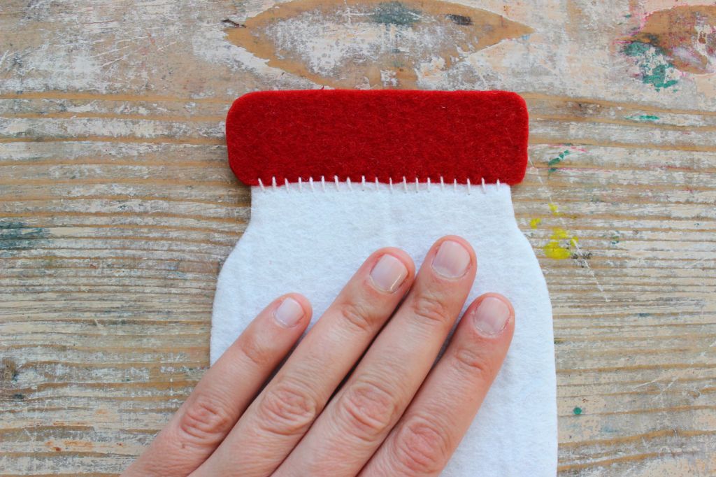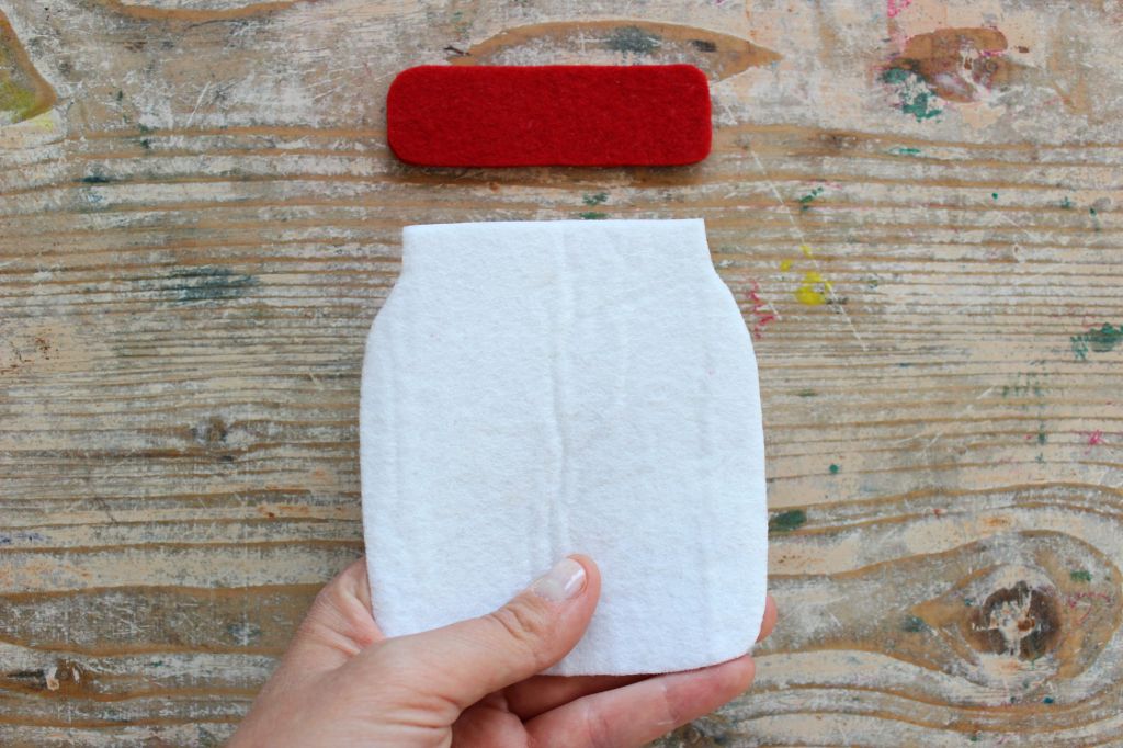 Per iniziare stampate il cartamodello e ritagliate tutte le sagome. Da un foglio di feltro bianco ricavate la sagoma del barattolo; da un ritaglio di feltro rosso ricavate la sagoma del tappo.