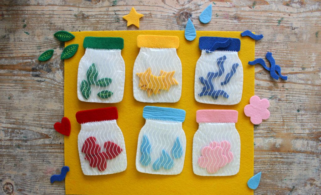 Ad ogni barattolo è associato un colore rappresentato dal tappo. Il bambino dovrà associare il giusto elemento al tappo corrispondente e inserire gli elementi nel barattolo corretto. Un gioco semplice e divertente per imparare i colori e a fare le giuste associazioni. Un’idea carina potrebbe essere anche quella di ricamare sui tappi i nomi dei colori.
