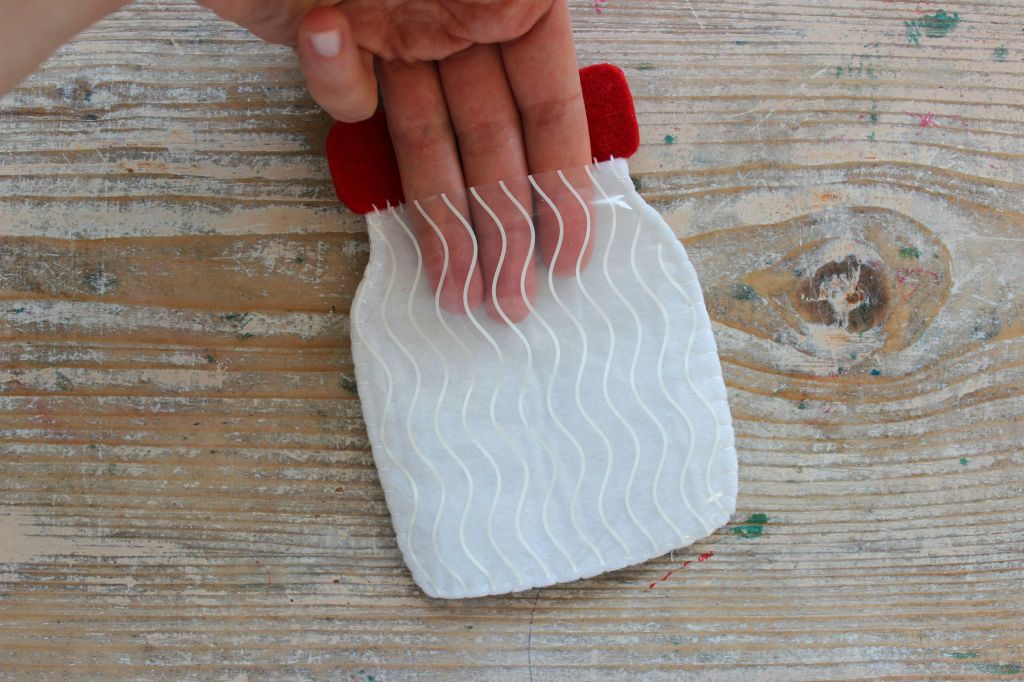 Con ago e filo cucite la sagoma di plastica su quella di feltro, in modo da creare una sorta di tasca. Lasciate aperta la parte superiore, che servirà per inserire i vari elementi del gioco.