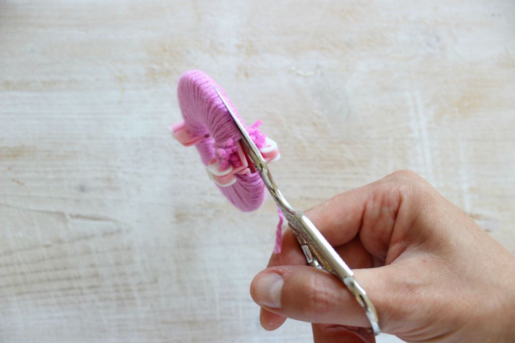 Con una forbice piccolina (tipo le forbici da ricamo) tagliate la lana lungo la circonferenza del telaietto. In questo passaggio dovete usare molta accortezza per non far uscire dal pom pom maker i fili di lana.