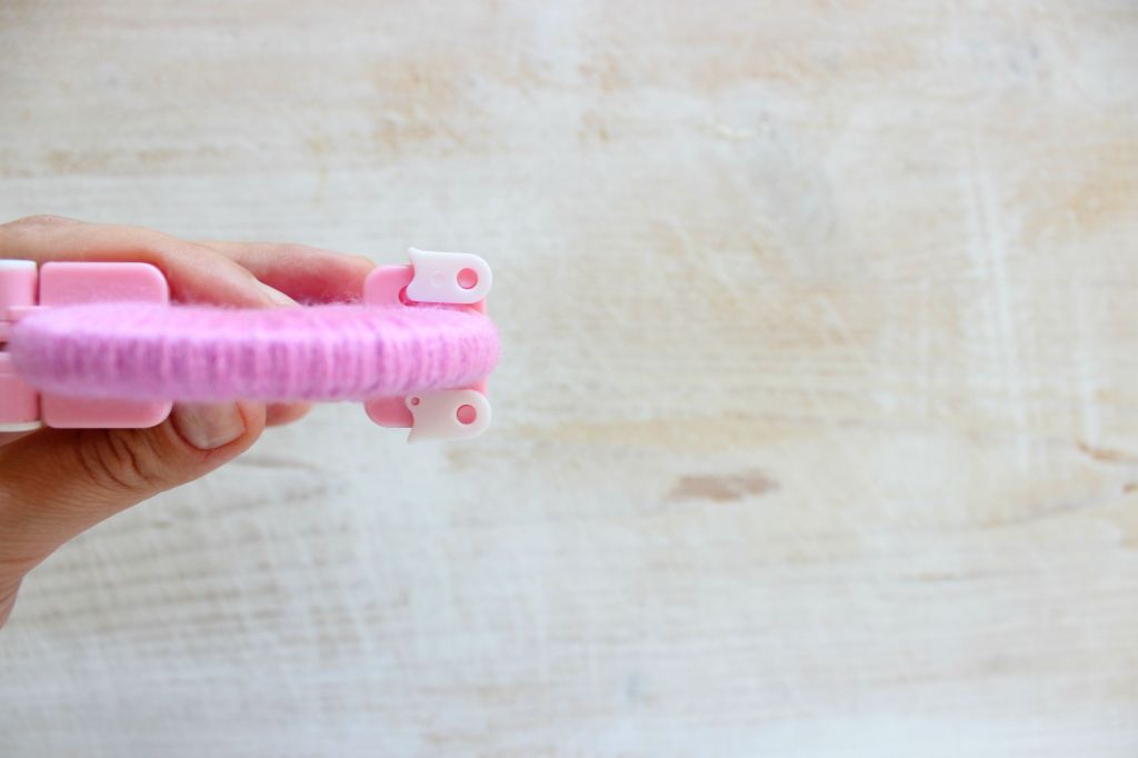 A questo punto tagliate un pezzo di filo di lana di circa 15 cm. Fate passare il filo al centro del telaio e annodate. Fate più giri di filo in modo da rendere ben saldo il pom pom fai da te.
