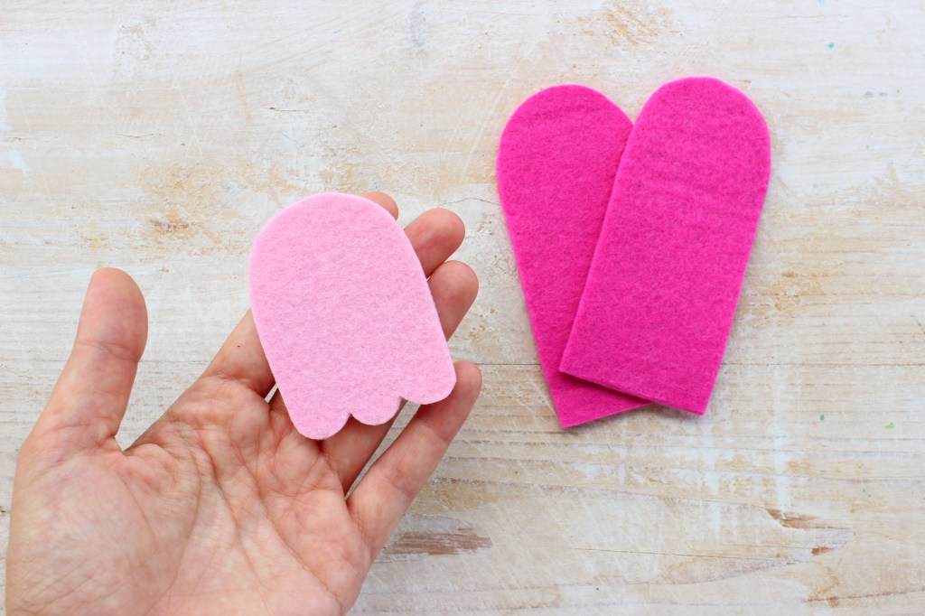 Utilizzando il cartamodello ricavate due sagome gelato dal feltro fucsia e una sagoma che sarà la glassa di copertura del gelato. Procedete stampando il cartamodello e ritagliando le figure sulla carta. Ponete le figure sul feltro, tracciate i contorni con una penna per tessuto e poi ritagliate con forbici ben affilate. Potete utilizzare anche una penna classica, ma fate in modo di non calcare troppo la mano per evitare che il segno resti visibile.