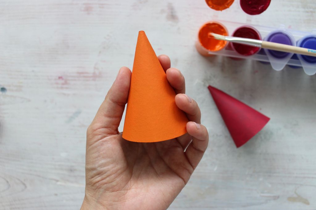 Utilizzando sempre il cartoncino di recupero create un cono lungo circa 5-6 cm e largo più o meno tanto quanto il diametro del tubo di cartone. Fissate il cono di carta con dei punti di spillatrice.