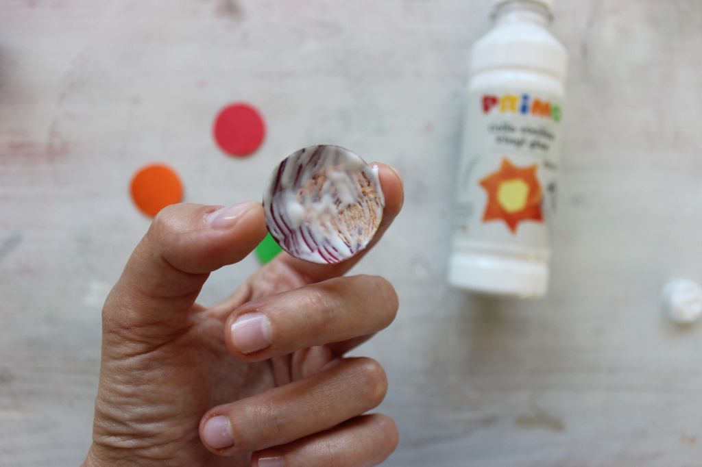 A questo punto bisogna incollare i dischi di cartone sui tubi dipinti precedentemente. Stendete uno strato di colla liquida sul retro dei cerchi e applicateli su ciascun tubo di cartone. I dischi di cartone devono essere allineati verticalmente. Per farli aderire bene mettete degli elastici sui dischi di cartone. La colla liquida ha un’asciugatura lunga, pertanto il pezzo da incollare deve restare in posizione per tutto il tempo. Lasciate asciugare completamente e poi togliete gli elastici.