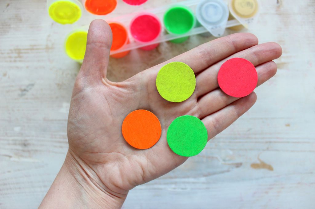 Dipingete i cerchi di cartoncino con la tempera fluo. Anche in questo caso decidete voi se dare più di una mano di colore. Dipingete il lato non stampato perché il colore aderirà molto meglio sulla superficie opaca. Inizialmente ero scettica riguardo la tempera fluorescente perché non pensavo fosse coprente e immaginavo di dover dare tante mani di colore; invece mi sono dovuta ricredere, perché pur essendo una tempera è davvero molto coprente.
