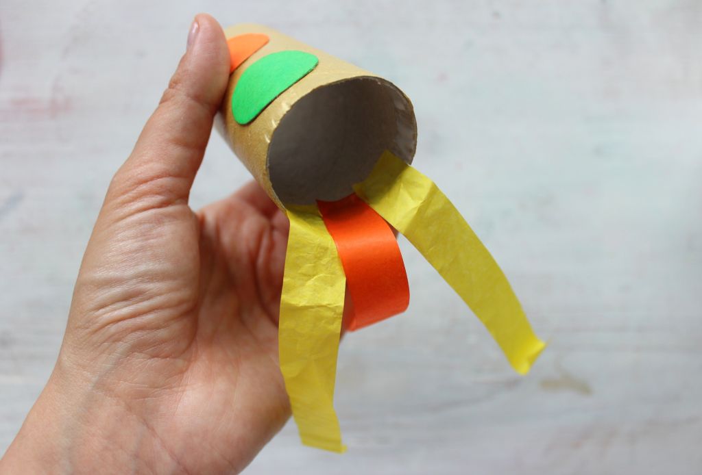 Incollate le strisce di carta velina una accanto all’altra nella parte inferiore ed interna del razzo. Io ho utilizzato due colori differenti di carta velina, alternando i colori fra una striscia e l’altra. Potete fare anche un razzo multicolor! Lasciate scegliere ai bambini e sicuramente vi stupiranno 😉