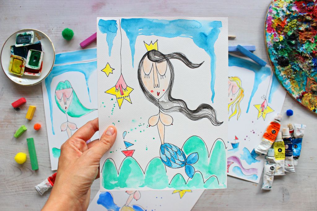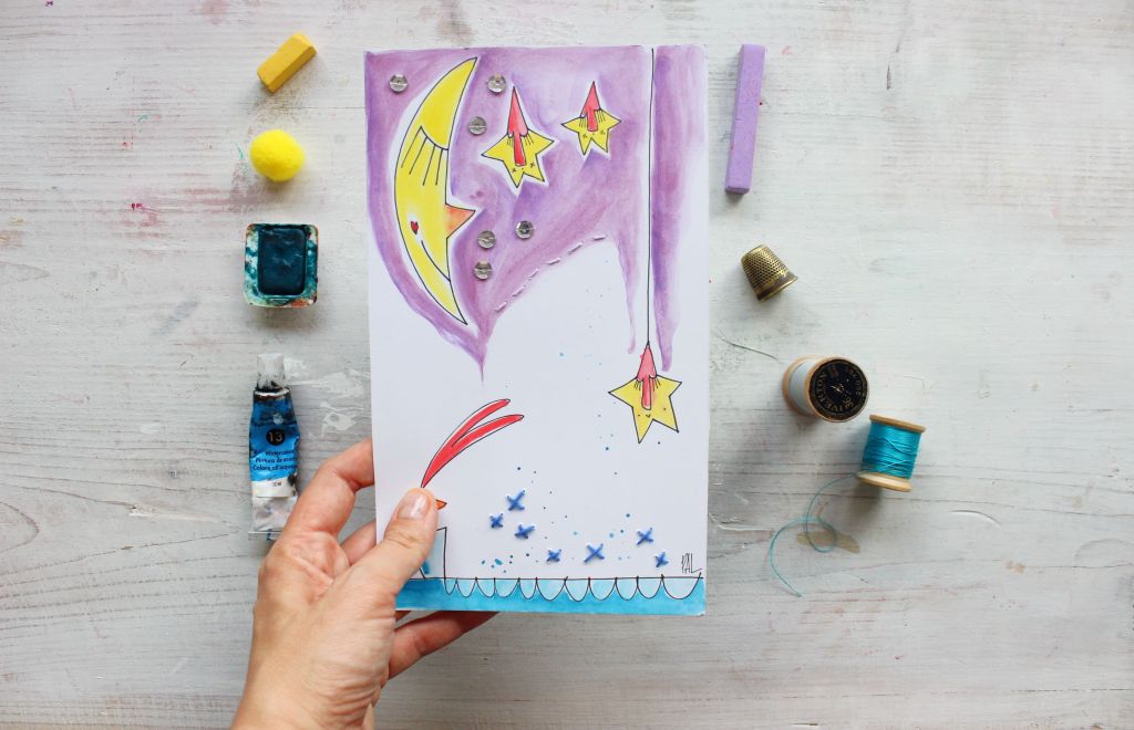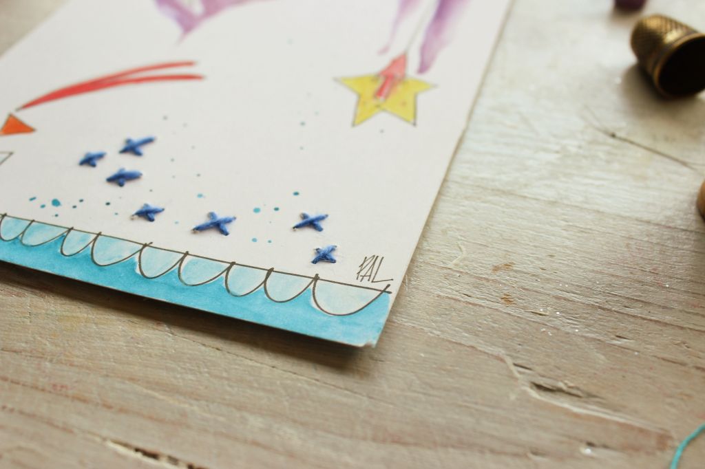 Riceverai in cambio una mia cartolina illustrata e diffonderemo un po’ di bellezza e di colore 🙂 Per chi non conoscesse le mie illustrazioni, dovete sapere che la mia tecnica artistica preferita è l’acquerello, soprattutto in commistione con il ricamo. Eh sì, mi piace molto ricamare piccoli dettagli sulla carta. I miei soggetti sono romantici e sognanti, fatti di lune e stelle, fiori bizzarri, sirenette, barchette e cuori in ogni dove.