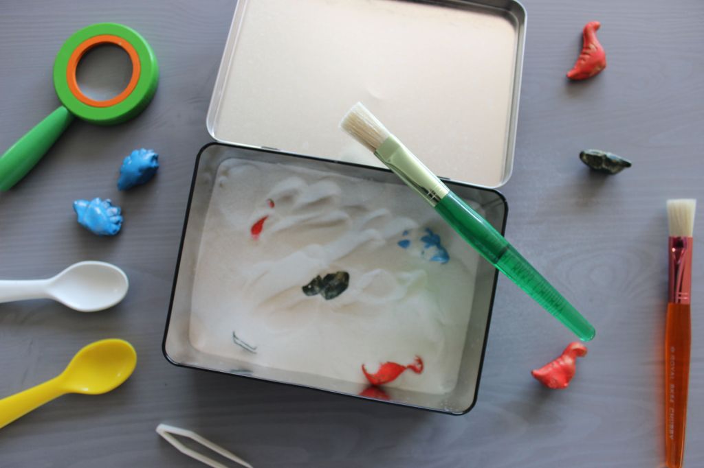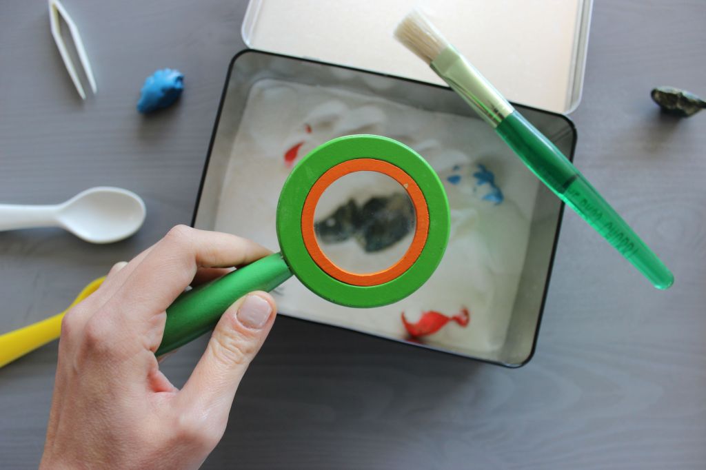 Procurate strumenti vari come ad esempio pinzette, cucchiai per scavare, pennelli, lenti d’ingrandimento e tutto quello che la fantasia vi suggerisce. Il bambino si divertirà tantissimo a scavare, manipolare la sabbia con le mani, osservare i reperti con la lente d’ingrandimento e sentirsi un vero archeologo.